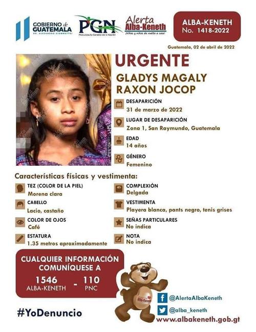 Para brindar información por el caso de Gladys Raxón puedes contactar a la PNC al número 110 o a la línea de alertas Alba Keneth 1546.