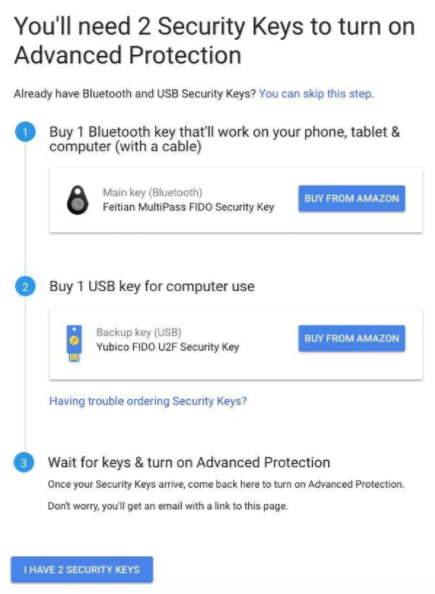 En primer lugar, necesitarás dos llaves de seguridad para acceder a tu cuenta. Una para tu computadora y una compatible vía Bluetooth para tus teléfonos celulares y tabletas. Las llaves sugeridas de Google cuestan un total de 43 dólares.
