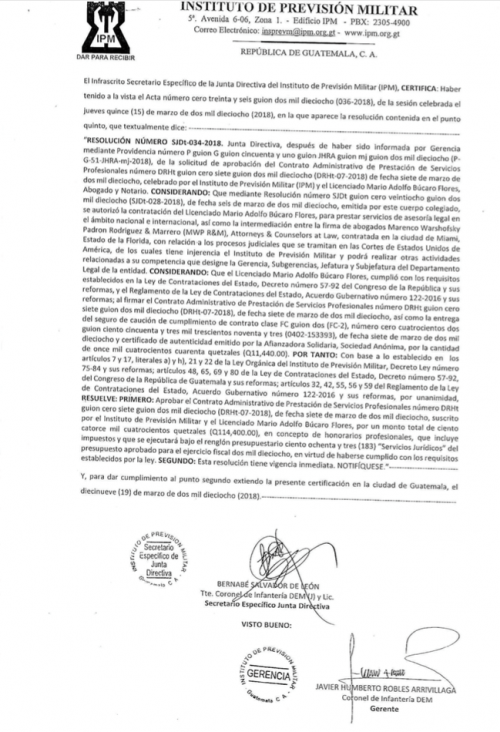 El puesto será ocupado por el abogado Mario Adolfo Búcaro Flores, quien hasta el 28 de junio fue asesor legal del Instituto de Previsión Militar (IPM), donde recibió 12 mil quetzales mensuales de salario.