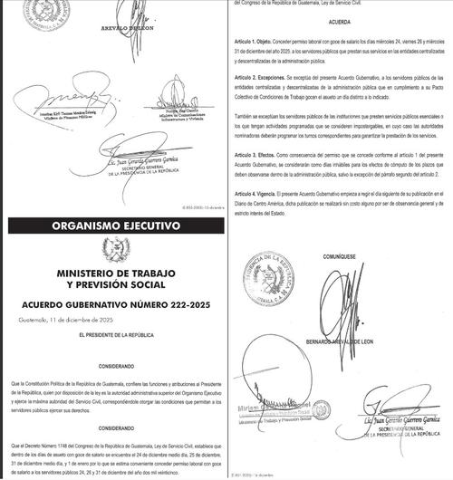 El Diario de Centro América (DCA) publicó el Acuerdo Gubernativo 222-2025 que establece permiso laboral de tres días a trabajadores del Estado por las fiestas de fin de año.