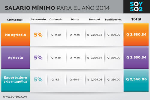 Para las actividades no agrícolas y agrícolas el salario quedó con Q2,530.34 mensuales con la bonificación incluida, para el sector exportador y maquilas el salario quedó en Q2,346.06 con la bonificación de Q250 incluída.