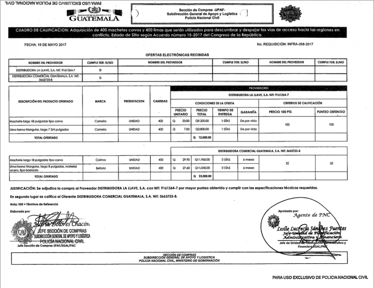 La Policía Nacional Civil (PNC) adquirió llantas para camión, piochas, palas, almádanas, alicates, machetes, limas, escaleras, motosierras y alquiló 30 sanitarios para los agentes que se encuentran en la zona del conflicto.