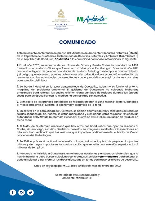 En el comunicado, Honduras señala que la contaminación que llega a la Bahía de Omoa proviene del río Motagua. El documento fue emitido tres días después de que el ministro de Ambiente y Recursos Naturales (MARN), Mario Rojas, declarara en conferencia de prensa que el problema del Motagua estaba resuelto.