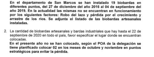 El Ministerio de Ambiente y Recursos Naturales (MARN) contabilizaba 103 biobardas hasta el 14 de enero de 2020, cuando terminó la administración de Morales. Para septiembre, tenían 62 funcionando en 13 departamentos.