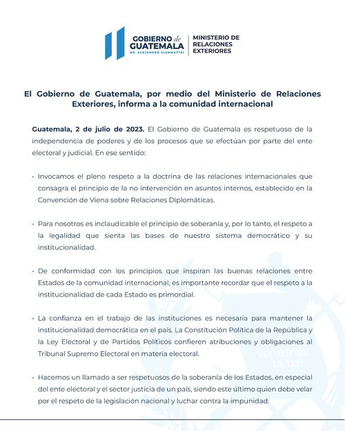 Por medio de un comunicado, el Gobierno de Guatemala a través del Ministerio de Relaciones Exteriores, pidió a organismos internacionales y otros países no intervenir en asuntos internos, especialmente en los relacionados con las Elecciones.