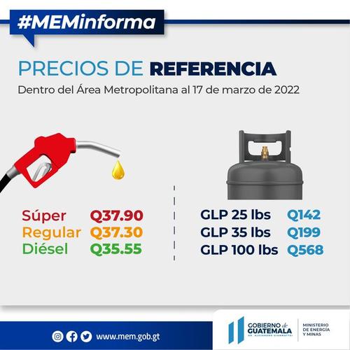 El Ministerio de Energía y Minas (MEM) publicó el listado de los precios de referencia para que los consumidores sepan cuánto dinero pagar por cada producto, tal y como lo anunció el presidente Alejandro Giammattei, con el objetivo de evitar especulación y promover la denuncia de los lugares que incrementen sus precios.