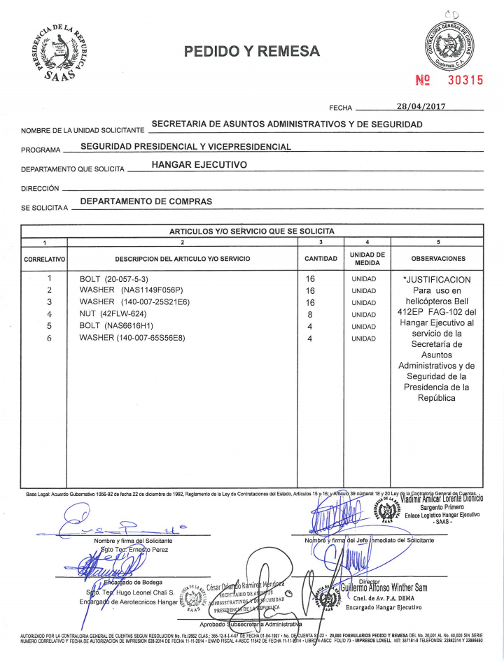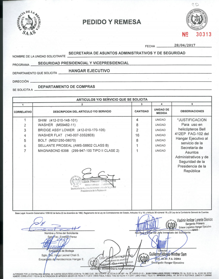 Esta institución tiene avanzados los procesos para adquirir 104 piezas para el helicóptero matrícula FAG102. Este viernes fue la recepción de ofertas por lo que, según los montos requeridos por las empresas interesadas, el Gobierno gastaría entre 86 mil y 114 mil quetzales por las mejoras.