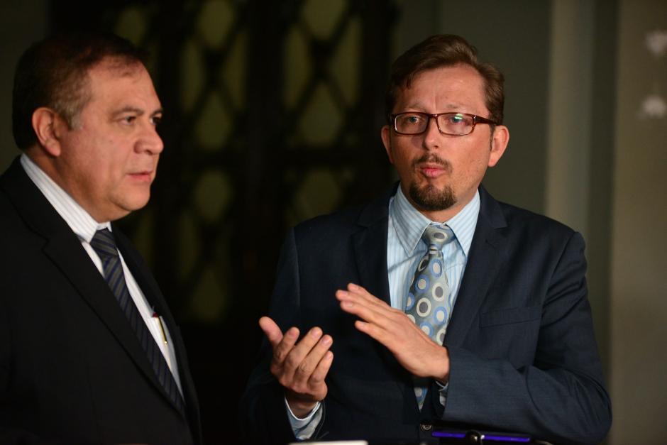 Luis Velásquez, a la izquierda, quiso explicar la donación de medicamentos. El vocero presidencial, Heinz Heimman, se apresuró a decir que la opinión de Velásquez no era oficial y solo la hacía como “voluntario“. (Foto: Jesús Alfonso/Soy502)