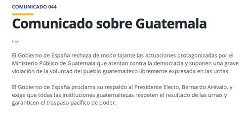 En la misma línea se pronunció el Gobierno de España, cuyas autoridades rechazaron de "modo tajante" las actuaciones protagonizadas el MP, por considerar que atentan contra la democracia y "suponen una grave violación de la voluntad del pueblo guatemalteco libremente expresada en las urnas".