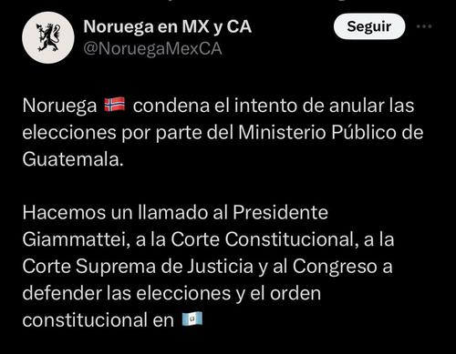 Igual que él, el Gobierno de Noruega emitió un breve comunicado a través de las redes sociales y llamó al presidente Alejandro Giammattei, Corte de Constitucionalidad, Congreso de la República y Corte Suprema de Justicia a defender el resultado de los comicios.