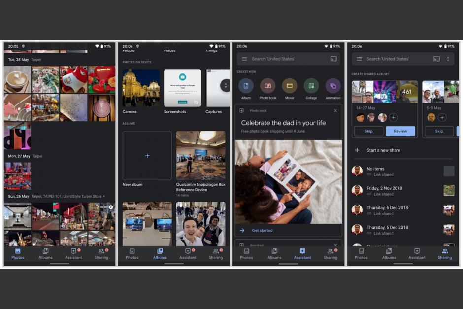 Google Fotos adoptó el modo oscuro o nocturno, lo que permite oscurecer la pantalla y mejorar la visibilidad en escenarios de poca luz.