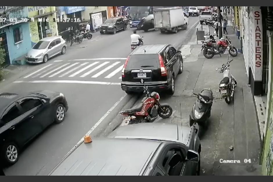Una cámara de seguridad captó el momento en que se produjo un fuerte accidente de tránsito en la 1ra. avenida y 8va. calle de la zona 1 del departamento de Escuintla, este 3 de julio.