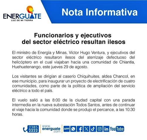 La empresa de Distribuidora de Electricidad de Oriente, S.A (Energuate) confirmó mediante un comunicado de prensa que el vuelo salió a las 8:00 horas de este jueves de la Ciudad de Guatemala, y el percance ocurrió a las 10:30 tras realizar una parada intermedia en la nueva subestación de Todos Santos, Huehuetenango.
