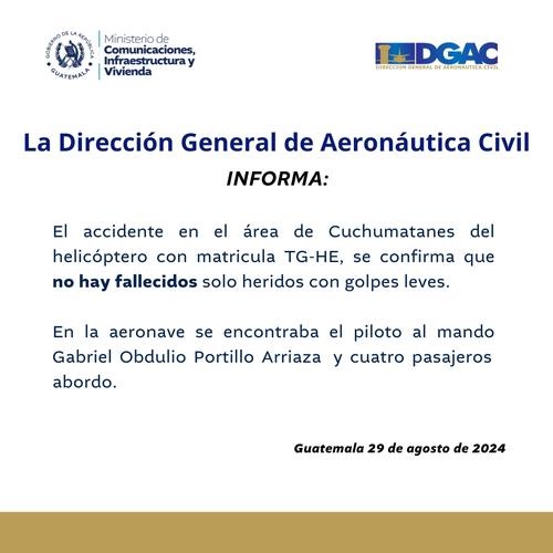 Mientras que la Dirección General de Aeronáutica Civil (DGAC) confirmó que no hubo personas fallecidas, únicamente heridos con golpes leves.