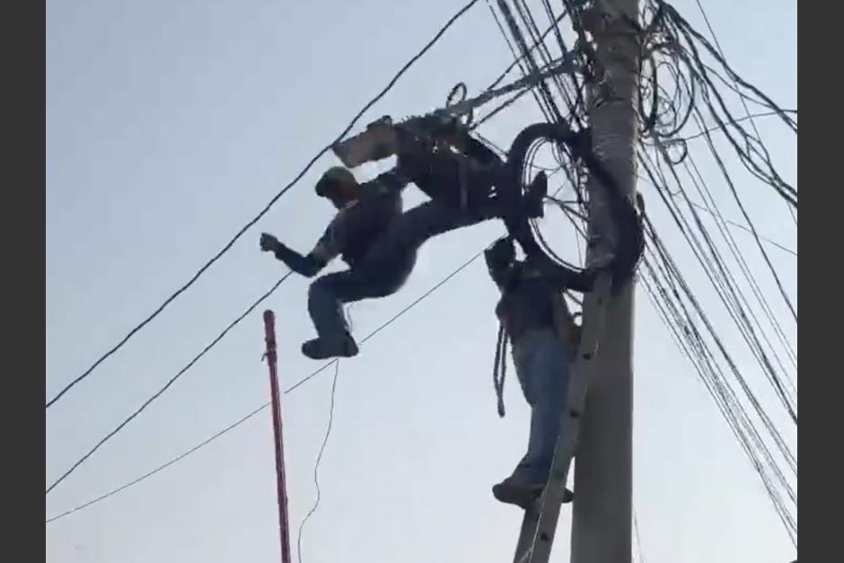 Pese a que se enreda entre los cables, termina sufriendo una fuerte caída, ante la mirada de sus compañeros de labores.