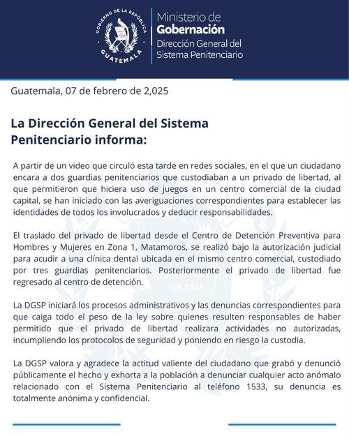 La Dirección General del Sistema Penitenciario (DGSP) emitió un comunicado confirmando que el traslado del reo fue autorizado judicialmente para asistir a una clínica dental dentro del centro comercial.