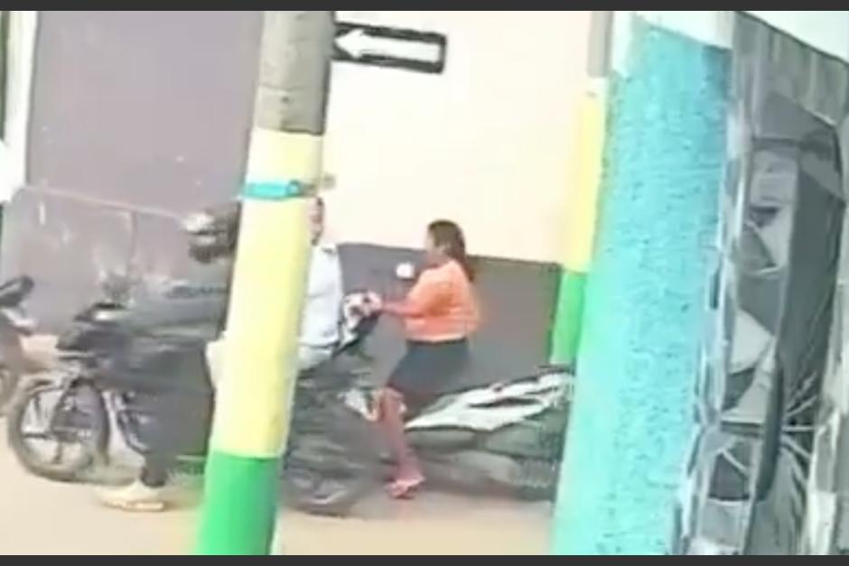 De pronto, dos individuos en otra moto se acercan para despojarla de sus pertenencias y de inmediato comienzan a forcejar.