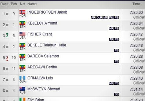 Los ganadores de la Diamond League fueron el noruego Jakob Ingebrigtsen, con un tiempo de 7:23:63 minutos. En segundo lugar quedó el etíope Yomif Kejelcha, con 7:23:64, y el tercer lugar lo obtuvo el estadounidense Beca Fisher, con 7:25:47 minutos.
