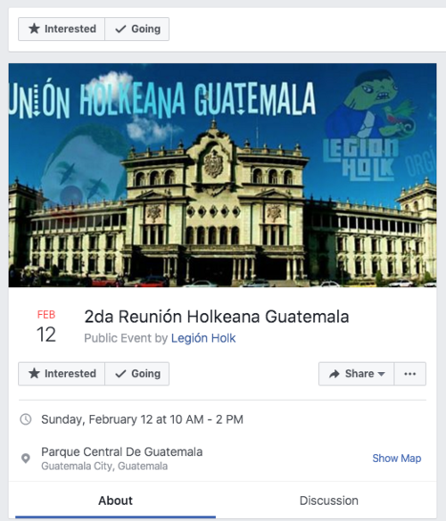El segundo domingo de febrero se realizará el segundo encuentro de miembros de Legion Holk que viven en Guatemala. Para participar en la reunión se solicita presentar DPI, llevar 50 quetzales y, por supuesto, ser parte de la comunidad.