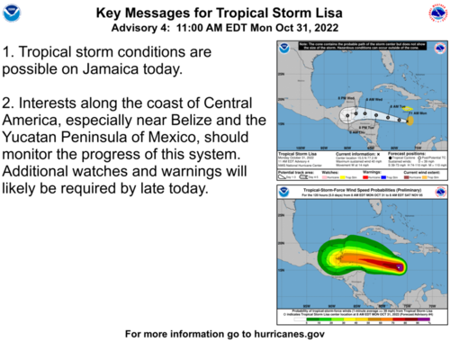 La mañana de este lunes 31 de octubre se formó la tormenta tropical Lisa en el Caribe, la cual se desplaza con vientos de 22 kilómetros por hora con dirección a Belice y Guatemala.
