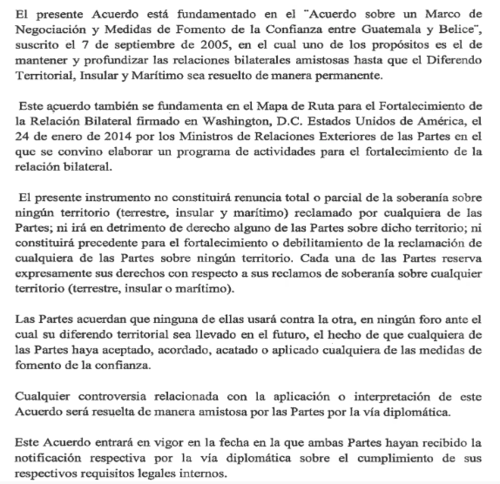 El acuerdo contiene cinco artículos y está avalado por el entonces ministro de Relaciones Exteriores de Guatemala, Carlos Raúl Morales y el procurador General y ministro de Relaciones Exteriores de Belice, Wilfred Elrington.