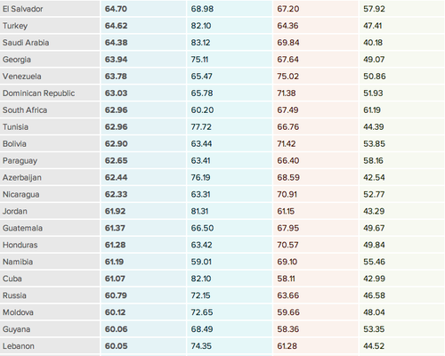 Guatemala se establece entre los rangos 49 a 68 que la ubica en la posición 77 de 130 países. La clasificación es baja e insatisfactoria a la suma de todos los rangos, pero en particular en sentidos de oportunidad para sus ciudadanos y baja inversión en materia social. Sus promedios son: