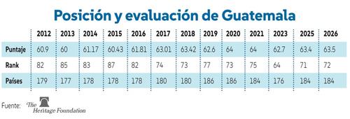 De acuerdo con el más reciente Índice de Libertad Económica 2026, publicado en marzo recién pasado por The Heritage Foundation, Guatemala mejoró ligeramente en su puntuación, al pasar de 63.4 el año pasado y subir a 63.5 en 2026, posicionándose en el puesto 72 de 184 países del mundo evaluados.