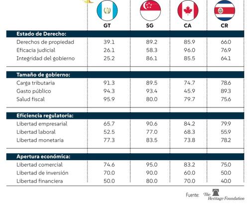 El informe refiere que "el historial de reformas estructurales de Guatemala ha sido desigual y las debilidades institucionales aún limitan el desarrollo económico a largo plazo. El ineficiente sistema judicial sigue siendo vulnerable a la interferencia política. Guatemala disfruta de una libertad comercial relativamente alta, pero la ausencia de avances en otras áreas de políticas que son fundamentales para sostener y promover la libertad económica socava el desarrollo económico dinámico. La corrupción se percibe como generalizada. Más de la mitad de la población vive en la pobreza; las remesas representan casi el 10 por ciento del PIB y el desempleo sigue siendo un problema".