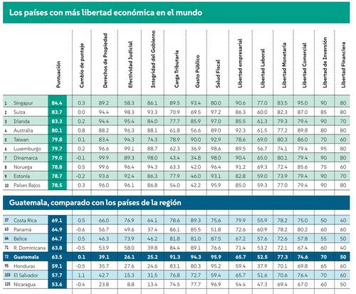 A nivel de los 32 países del continente americano, Guatemala ocupa el puesto 15 y según el informe, su puntuación de libertad económica es más alta que los promedios mundiales y regionales. Desde esta perspectiva, la economía guatemalteca se considera "moderadamente libre". Un aspecto que llama la atención es que, según el mismo índice, se puede observar que las personas que viven en países con altos niveles de libertad económica gozan de mayor prosperidad, más libertades políticas y civiles, y una vida más larga.