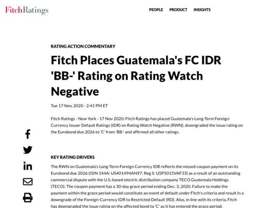La firma internacional Fitch Ratings bajó la calificación para Guatemala de los eurobonos que vencen en 2026 de BB- a C y colocó a Guatemala en su calificación de riesgo crediticio en observación negativa el "Rating Watch Negative" (RWN).