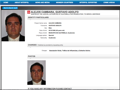 El empresario y exsecretario privado de la presidencia durante el gobierno de Álvaro Colom, Gustavo Adolfo Alejos Cámbara de 49 años, es uno de los hombres más buscados en el mundo; luego de que la Organización Internacional de Policía Criminal (INTERPOL) emitiera una alerta para su búsqueda en los 190 países donde la estructura de seguridad tiene presencia.