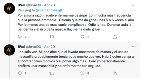 Otros tienen razones muy personales, como un usuario que explicó que tiene tendencia a enfermarse de gripe varias veces al año y desde que usa la mascarilla solo una vez se ha enfermado, por lo que seguirá usándola.