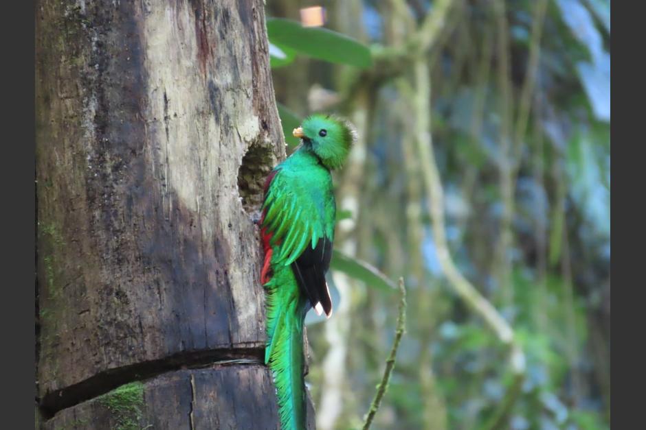 La pareja de quetzales fue captada mientras elaboraba su nido en un tronco del refugio donde habitan.