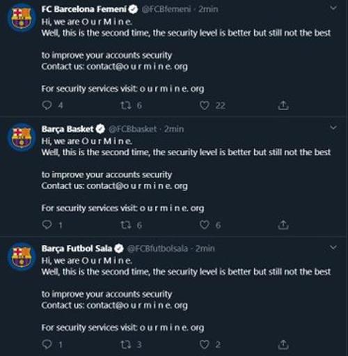 “Hola somos OurMine, vuestro nivel de seguridad es buen pero no el mejor. Para mejorar la seguridad de las cuentas contactad con: contact@ourmine.org. Por servicios de seguridad visite: ourmine.org”, decía el mensaje colgado en las redes, antes de que el Barcelona tomara de nuevo el control.