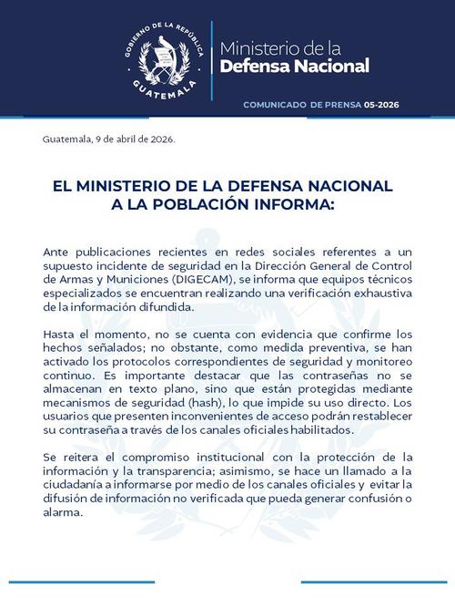 Esto se da luego de que en las últimas horas surgieran publicaciones de un supuesto "hackeo" en el que habría sido robada la base de datos de las personas portadoras de armas en Guatemala.