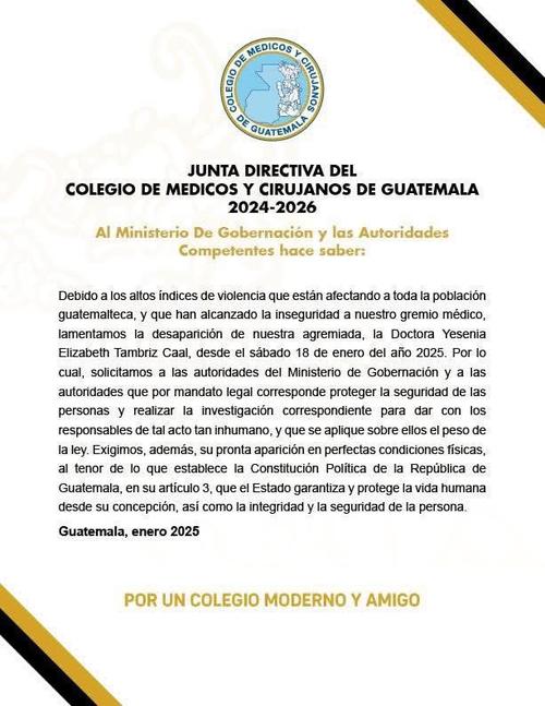 Por aparte, el Colegio de Médicos y Cirujanos de Guatemala repudió los índices de violencia que afectan a los ciudadanos, y en esta ocasión ha vulnerado la integridad de una de sus agremiadas, la doctora Yesenia.