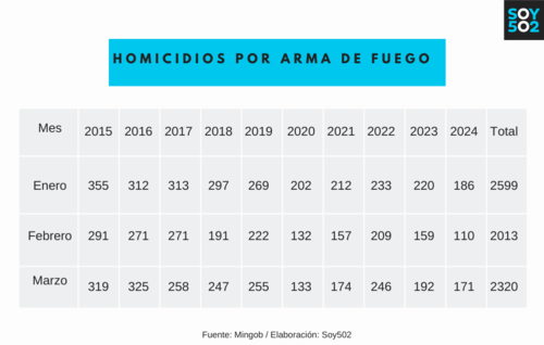 Al hacer una comparación entre los meses de enero, febrero y marzo de 2015 a 2024, este último año, que empezó con un nuevo Gobierno, resalta que ha sido el menos violento, según detallan las estadísticas.