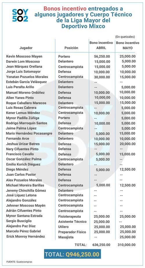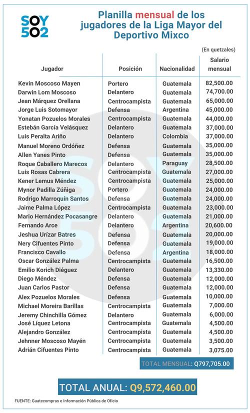 ¿Por qué la cifra es tan elevado? Porque hay jugadores que devengan al mes más de 80 mil quetzales, tal es el caso de Kevin Moscoso Mayen quien recibe un salario mensual de 82,500 quetzales.