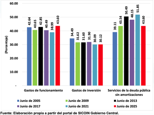 "Al desagregar el gasto público por su tipo, resalta que los gastos de funcionamiento del primer semestre de 2025, de 4.56% del Producto Interno Bruto (PIB), corresponden al tercer mayor monto del período 2004-2024, y superó el monto del segundo año de los últimos cinco gobiernos", explicó Jorge Lavarreda, investigador de la organización.
