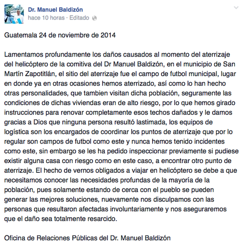 En el municipio de San Martín Zapotitlán, Retalhuleu, cuatro viviendas resultaron con daños en sus techos tras el paso del helicóptero en el que se transportaba el precandidato del Partido Libertad Democrática Renovada (Lider), Manuel Baldizón, que aterrizó muy cerca de los inmuebles. El hecho ocurrió el domingo, cuando Baldizón acudió a ese municipio para participar en un mitin con simpatizantes pero la aeronave pasó muy cerca de las viviendas.