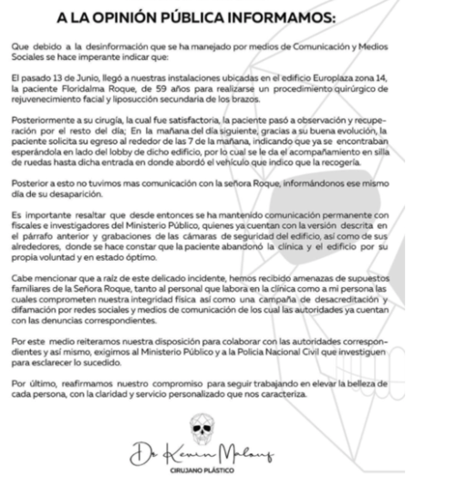 "El pasado 13 de junio, llegó a nuestras instalaciones ubicadas en edificio Europlaza zona 14, la paciente Floridalma Roque, de 59 años para realizarse un procedimiento quirúrgico de rejuvenecimiento facial y liposucción secundaria de brazos", se lee en el comunicado.
