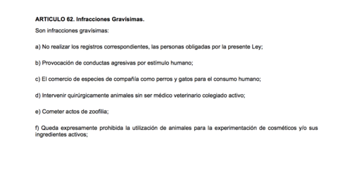 Dicha normativa establece en su artículo 62 de "Infracciones gravísimas" en el inciso "e" el cometer actos de zoofilia, acto que es sancionado con una multa.