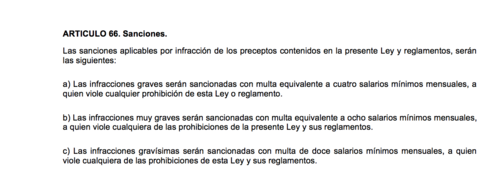 "Las infracciones gravísimas serán sancionadas con multa de doce salarios mínimos mensuales, a quien viole cualquiera de las prohibiciones de esta Ley y sus reglamentos", se lee en la normativa antes mencionada.
