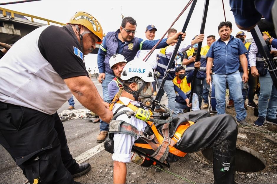 Así fue como un empleado municipal descendió en un pozo, para verificar las causas del hundimiento en la ruta al Pacífico. pic.twitter.com/NN6pG90xMV