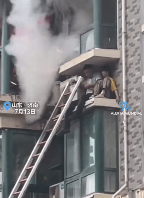 | ¡Héroe! Momento en que un hombre trepó al cuarto piso de un edificio residencial en llamas en la provincia de Shandong, China, para rescatar a una niña que pedía ayuda desesperadamente desde una ventana.