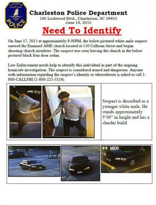 La policía de Charleston difundió imágenes del atacante, obtenidas de cámaras de seguridad. El sospechoso se ve abandonando la iglesia en un sedan negro.
