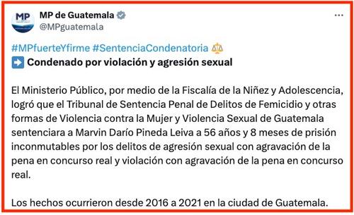 Tras las investigaciones correspondientes, se descubrió que Pineda había estado agrediendo a la pequeña desde 2016 hasta 2021. Todo ocurrió en la colonia Justo Rufino Barrios, en la zona 21 capitalina.