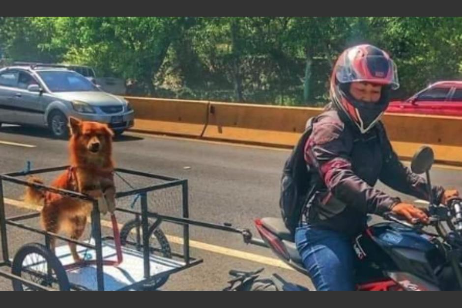 Su mascota lo acompaña en un carrito añadido a la motocicleta, con su correa, el perro va atado para no caer a la carretera.