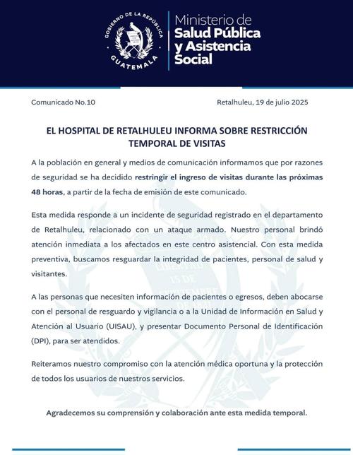 A través de un comunicado, el Ministerio de Salud Pública y Asistencia Social informó que el Hospital de Retalhuleu restringió las visitas durante las próximas 48 horas.
