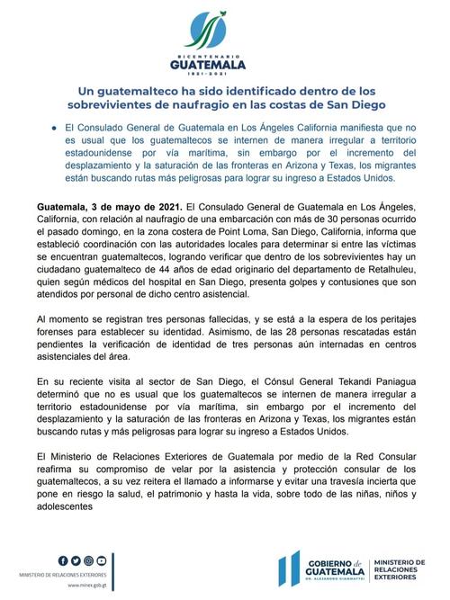 El Ministerio de Relaciones Exteriores confirmó que hay un guatemalteco entre las víctimas de un naufragio de migrantes en las costa de San Diego, California, Estados Unidos.